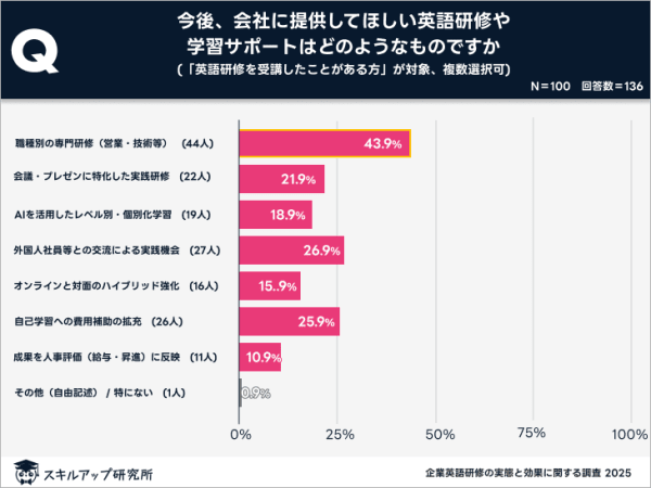 一方、受講者が最も望むのは「職種別の専門研修」(43.9%)であり、より自身の専門性に紐付いたスキルアップを求めている。