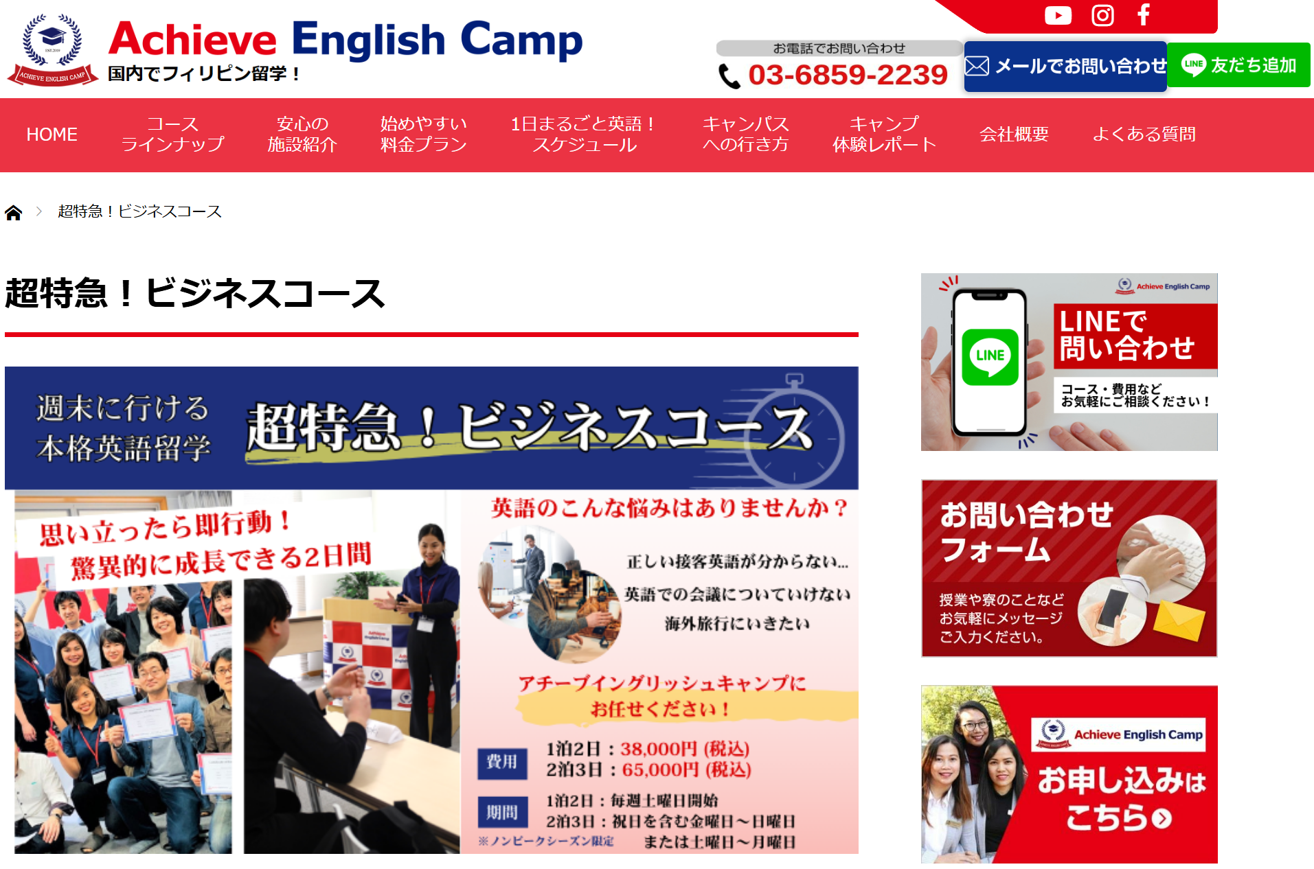Achieve English Camp | 約10万〜15万円/週 | 1週間程度 | TOEIC・英検面接対策や実務英語強化 |