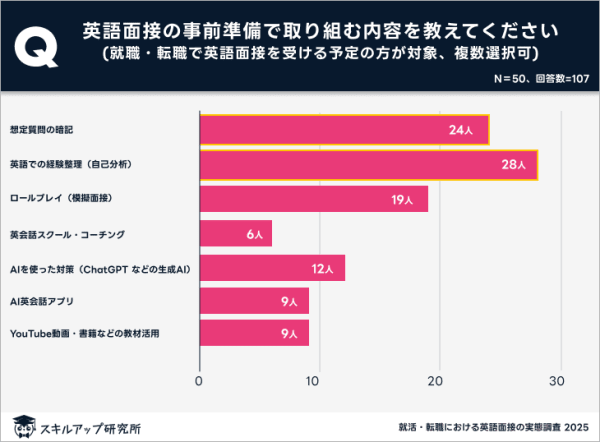 英語面接の事前準備として取り組む予定の内容を尋ねたところ、「英語での経験整理(自己分析)」と「想定質問の暗記」が、ともに約半数を占めた。