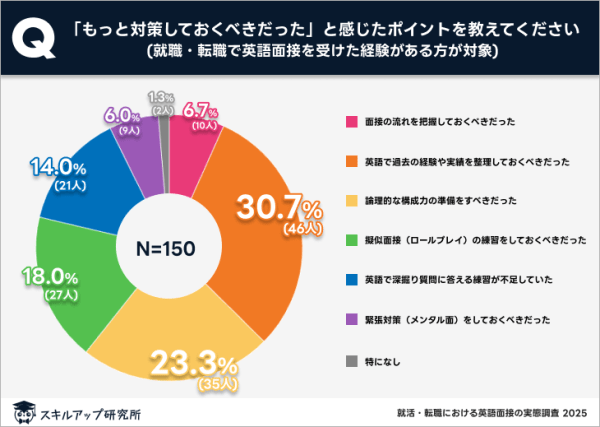 「もっと対策しておくべきだった」と感じたポイントについては、「英語で過去の経験や実績を整理しておくべきだった」が30.7%で最も多かった。