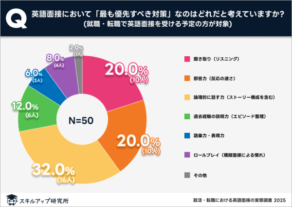 未経験者では、「論理的に話す力(ストーリー構成を含む)」を最も重視する人が32%と最多だった一方、「即答力」や「リスニング」はそれぞれ20%にとどまっている。