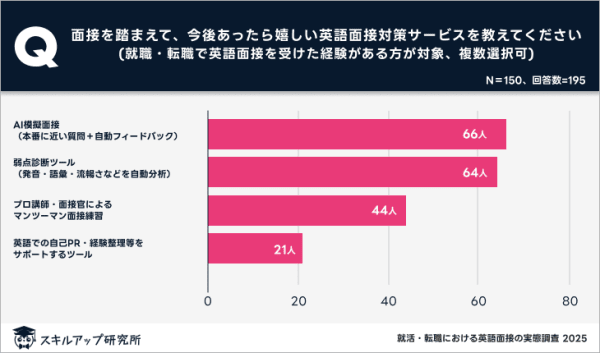 さらに、今後あったら嬉しい英語面接対策サービスについて尋ねたところ、「AI模擬面接(本番に近い質問+自動フィードバック)」が最多となった。