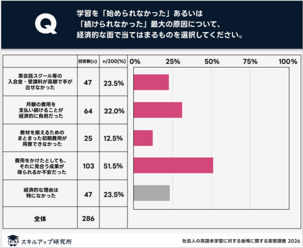 経済的な原因を調査したところ、「成果が得られるか不安だった」という回答が51.5%と過半数を超えた。金額の高さよりも、投資に対するリターンへの不透明さ、コストパフォーマンスへの不安が最大の壁になっている。