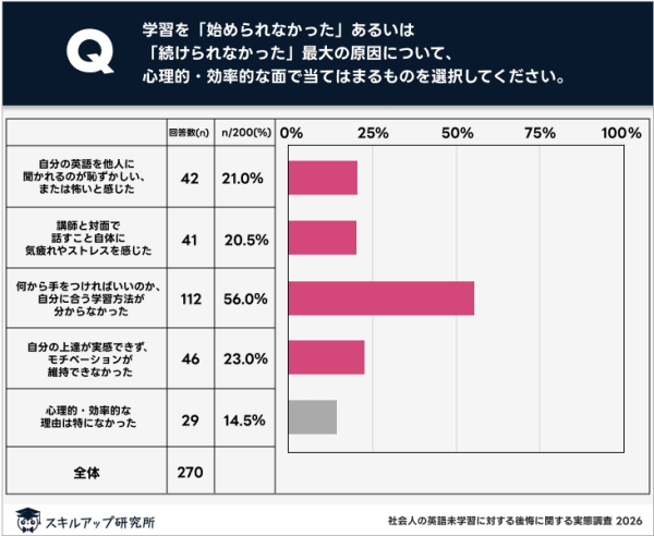 心理的・効率的な要因を調査したところ、「自分に合う学習方法が分からなかった」という回答が56%と過半数を超えた。