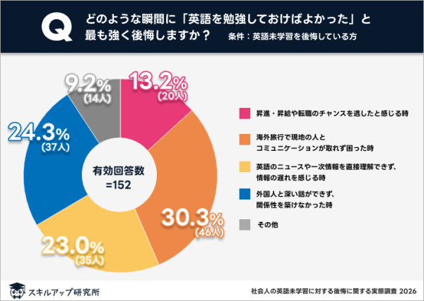 英語未学習を後悔している152人を対象に、後悔する瞬間で最も多い場面を尋ねたところ、「海外旅行で現地の人とコミュニケーションが取れず困った時」が30.3%で最多だった。