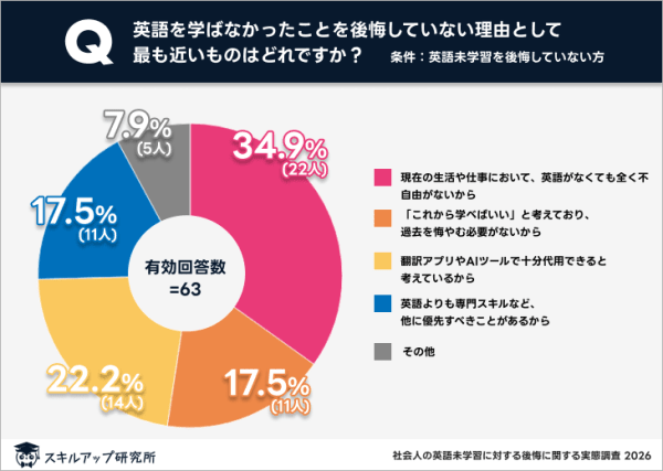 英語を学ばなかったことを後悔していない63人にその理由を聞いたところ、「現在の生活や仕事において、英語がなくても全く不自由がないから」が34.9%で最も多かった。